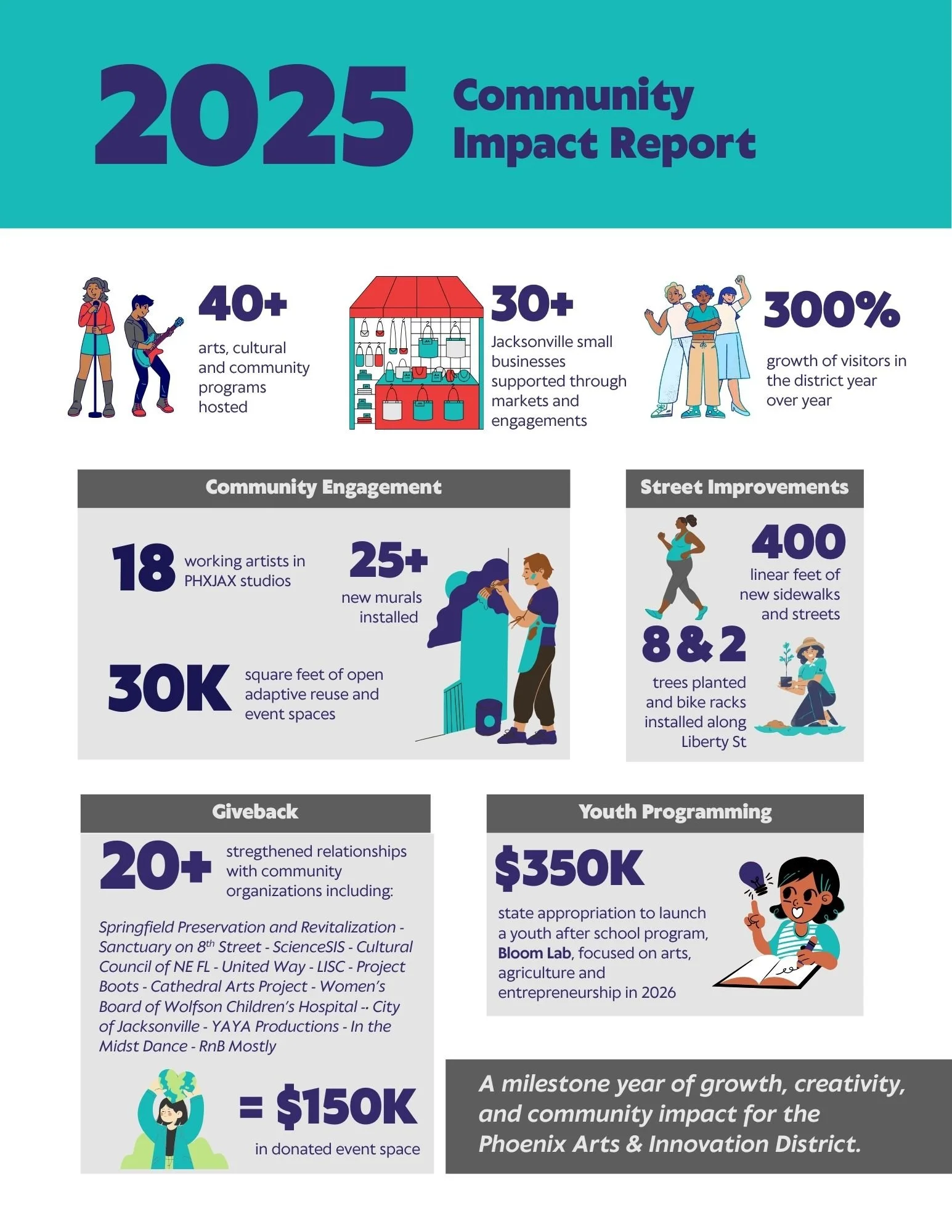 In 2025, Friends of PHXJAX made significant strides in advancing its mission of regenerative development in Jacksonville’s North Springfield neighborhood. Through a diverse range of free community events—including makers markets, affordable artist studios, housing workshops in partnership with LISC Jacksonville, health and wellness initiatives, and youth programs—we fostered a thriving, inclusive environment where creativity, economic opportunity, and well-being intersect. By supporting local artists, entrepreneurs, and residents, we laid the groundwork for sustainable growth, reinforcing our commitment to affordable housing, business incubation, and cultural enrichment. This year’s initiatives reflect our dedication to building a vibrant, resilient community where arts, innovation, and collective transformation flourish.